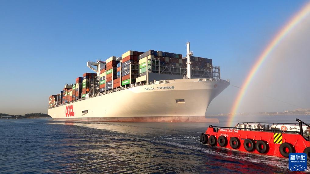 “東方比雷埃夫斯”號大型集裝箱船10日抵達希臘最大港口比雷埃夫斯。港方以“水門禮”歡迎這艘近400米長的集裝箱船首航掛靠比港。“東方比雷埃夫斯”號長399.9米,寬61.3米,可裝載24188個標準集裝箱,是世界上最大的集裝箱船之一。