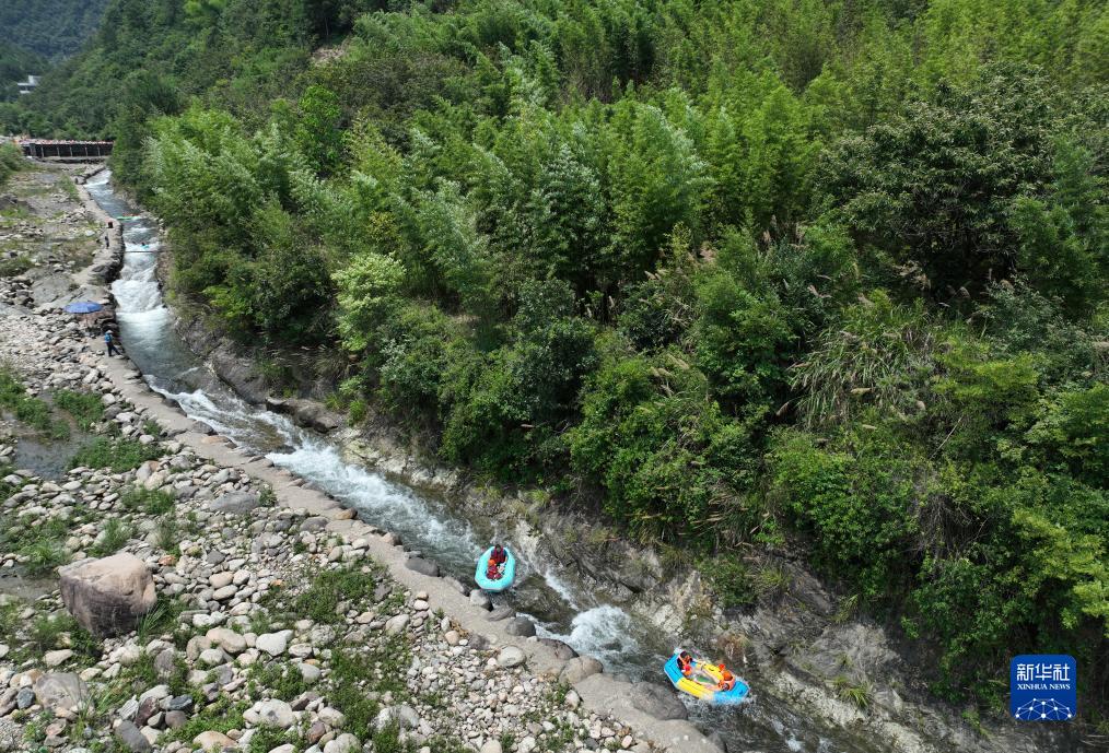 7月11日,人們在杭州臨安龍崗鎮浙西大龍灣體驗峽谷漂流(無人機照片)。