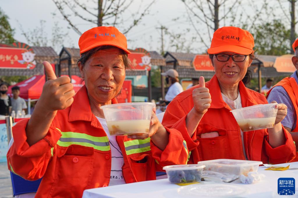 7月11日,在安徽省宿州市蕭縣水墨圣泉古鎮(zhèn)廣場,環(huán)衛(wèi)工人品嘗羊湯。