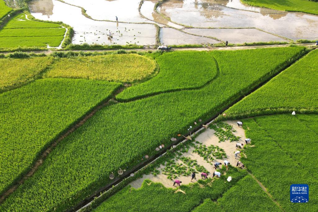 盛夏時節,湖南省多地進入一年當中最繁忙的“雙搶”季節,農民們冒著酷暑搶收早稻、搶插晚稻,為全年糧食豐產打下基礎。新華社發(李建新 攝)