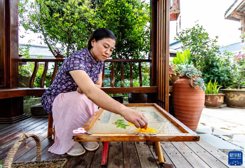 7月11日,游客在貴州省遵義市播州區楓香鎮花茂村體驗手工古法造紙。