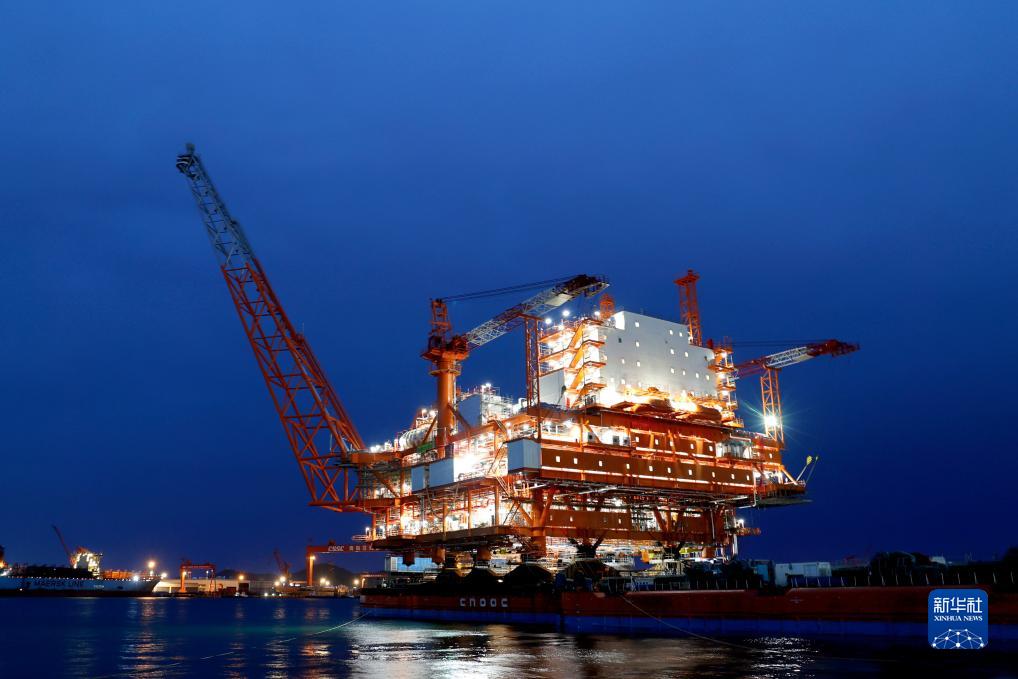 這是7月10日在山東省青島市拍攝的完成裝船后的渤中19-6凝析氣田一期項目中心平臺夜景。