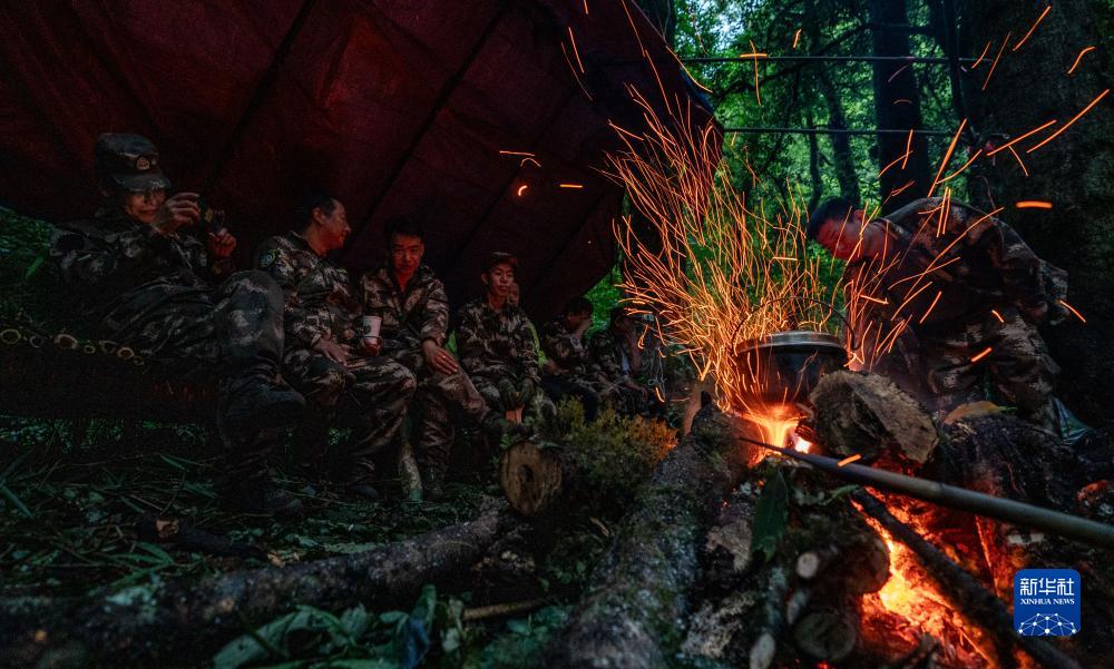7月8日,在高黎貢山國家自然保護區,巡護隊員在篝火旁休息。新華社記者 江文耀 攝