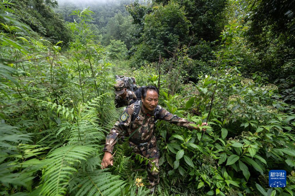 7月8日,何貴品(前)帶領巡護隊在高黎貢山國家級自然保護區中行進。新華社記者 費茂華 攝