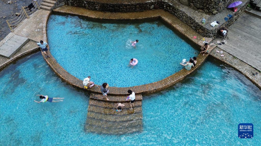 7月11日,在廣西賀州市平桂區(qū)鵝塘鎮(zhèn)瑤族山村槽碓村,人們?cè)谏介g泳池游泳戲水(無(wú)人機(jī)照片)。