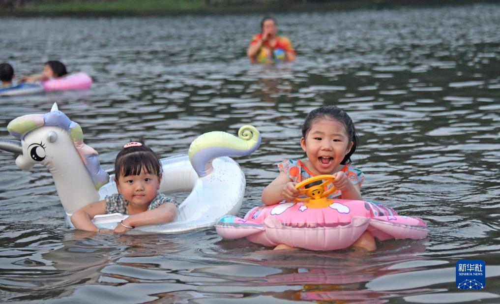 7月11日,孩子們在浙江省臺州市仙居縣永安溪南峰街道浮石園天然浴場戲水玩耍。