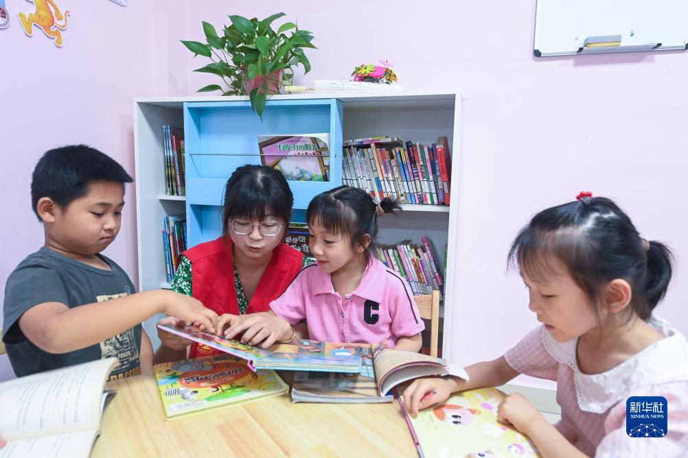 7月12日,在當(dāng)日開班的烏橋村暑期夏令營里,孩子們在志愿者的陪伴下讀書。為解決外來務(wù)工人員子女暑期“看護(hù)難”問題,嘉興市南湖區(qū)新豐鎮(zhèn)社工站聯(lián)合烏橋村開展“候鳥歸巢,歡樂一‘夏’”暑期夏令營,外地來此過暑假的小候鳥們可以在這里學(xué)習(xí)科普知識,接受暑期安全教育,參加繪畫、手工興趣課等。