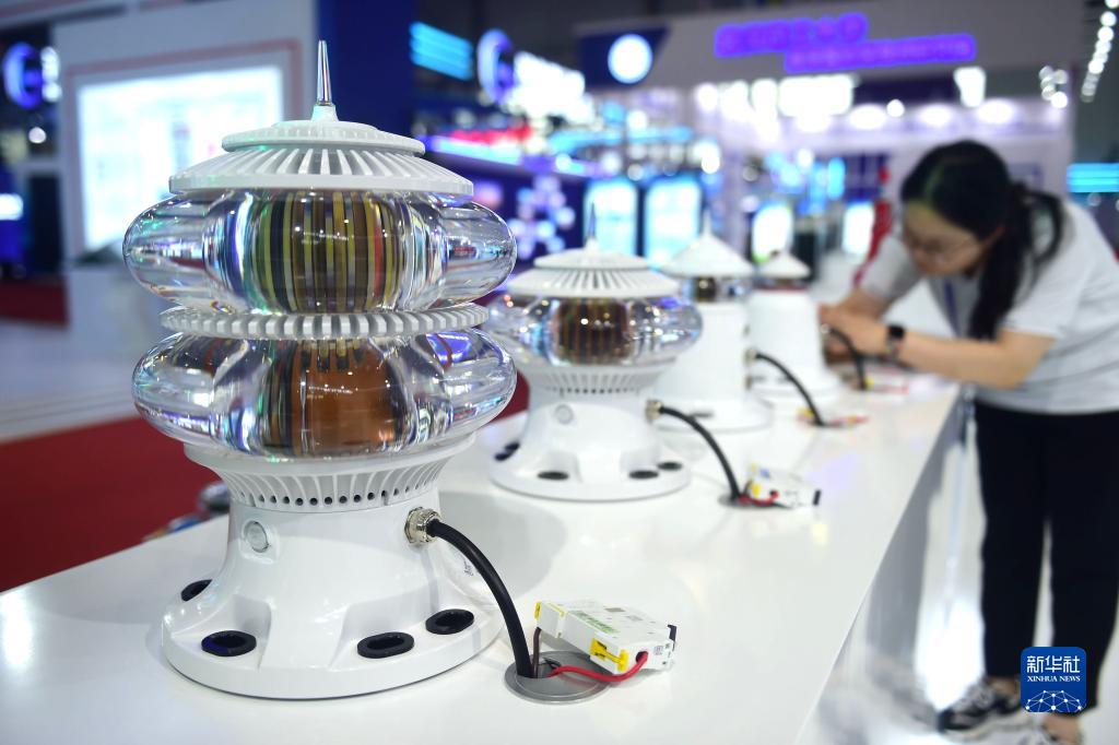 7月12日,在航海科技博覽會上拍攝的支持北斗遠(yuǎn)程數(shù)據(jù)的智能化航標(biāo)燈。