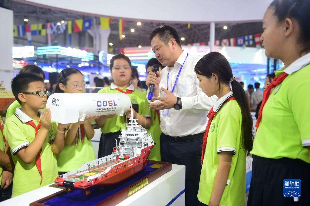 7月12日,小學(xué)生在航海科技博覽會上參觀LNG清潔能源動力的船舶模型。