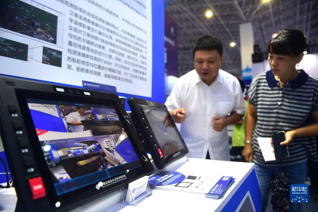 7月12日,參展單位工作人員(左)向參觀者介紹新一代多功能北斗船載智能終端設備。