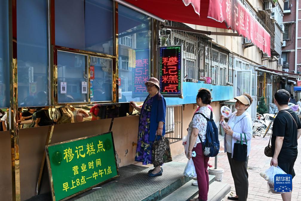 7月10日,市民在天津西北角一家還未開門的店鋪前排隊等待。