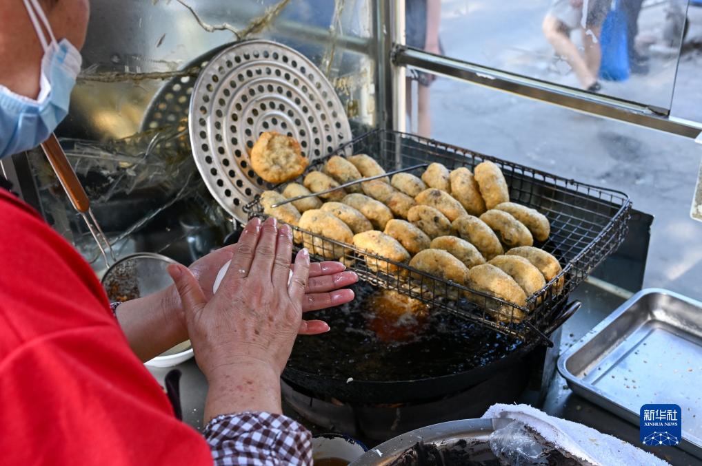 7月10日,在天津市紅橋區西關大街一家早點鋪,商家在制作炸糕。