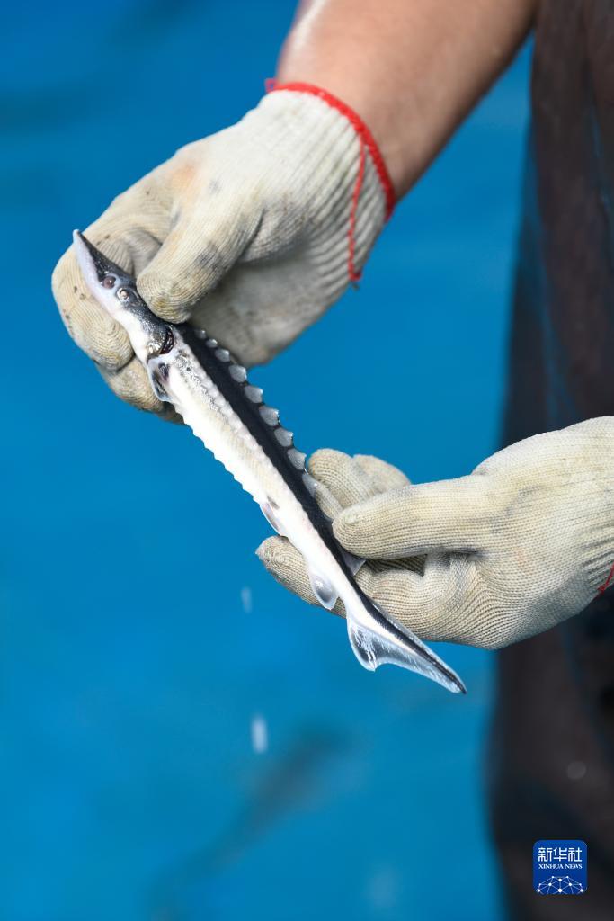 2023年6月27日,在宜賓珍稀水生動物研究所與四川省農科院水產研究所合作的繁育基地,周亮展示用于增殖放流的長江鱘幼魚。新華社記者 胥冰潔 攝