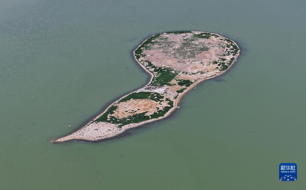 7月11日,大批候鳥在康巴諾爾國家濕地公園湖心島覓食(無人機照片)。