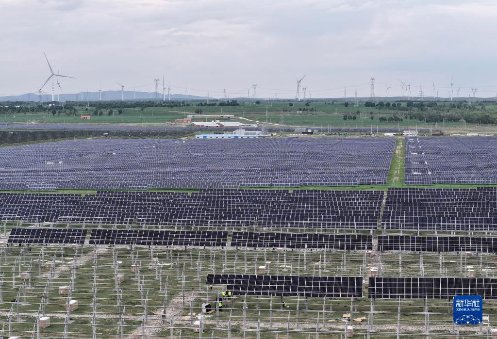 這是張家口市康保縣張紀鎮一處施工中的光伏發電場(7月11日攝,無人機照片)。