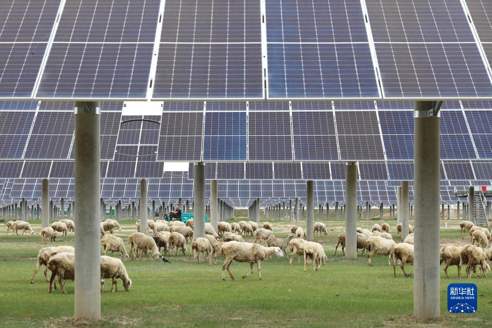 7月11日,在張家口市康保縣張紀鎮,羊群在光伏板下覓食。