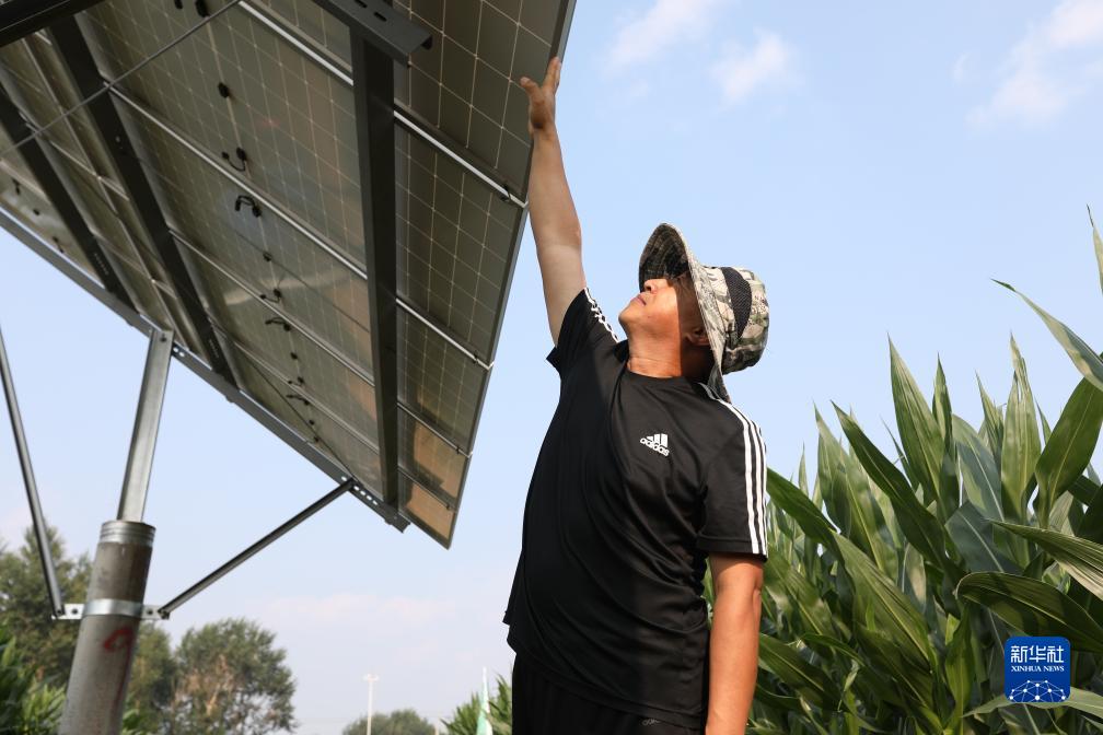 7月11日,在遼寧省彰武縣馮家鎮(zhèn)哈大冷村,馮家鎮(zhèn)政府工作人員在檢查太陽能光伏發(fā)電設(shè)備。