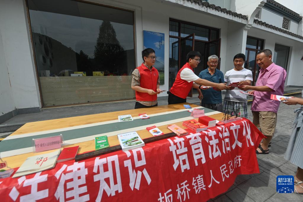 7月13日,在杭州市臨安區(qū)板橋鎮(zhèn)上田村文化禮堂前,板橋鎮(zhèn)聯(lián)合共建單位舉行“法律服務到村口”活動,黨員志愿者發(fā)放宣傳手冊并解答群眾的法律問題。