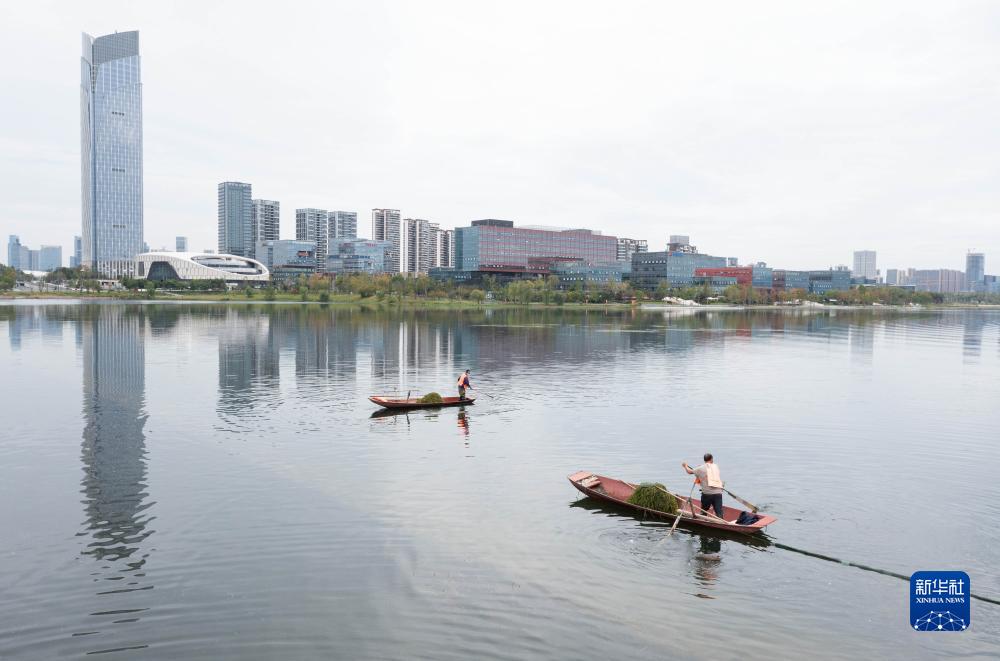 在四川天府新區(qū)興隆湖,工作人員賴小利(左)在撈水草(2022年9月21日攝)。新華社記者 江宏景攝