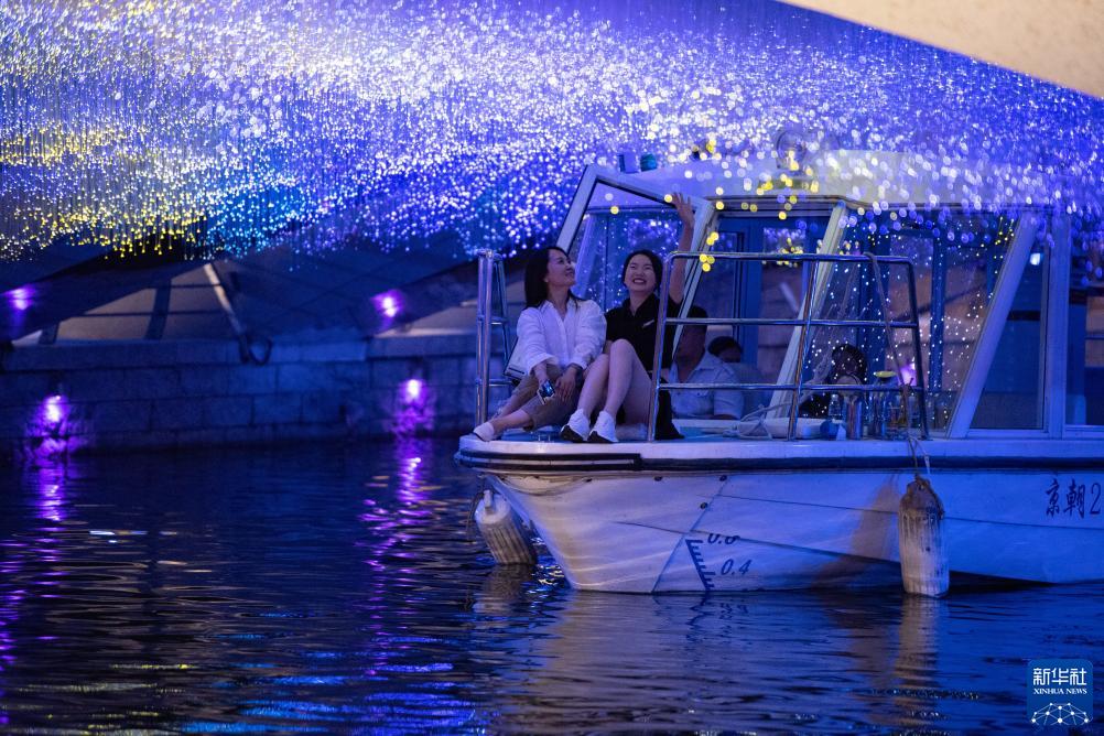 這是人們乘坐北京亮馬河游船經過被裝點成“星空”的好運橋(6月16日攝)。