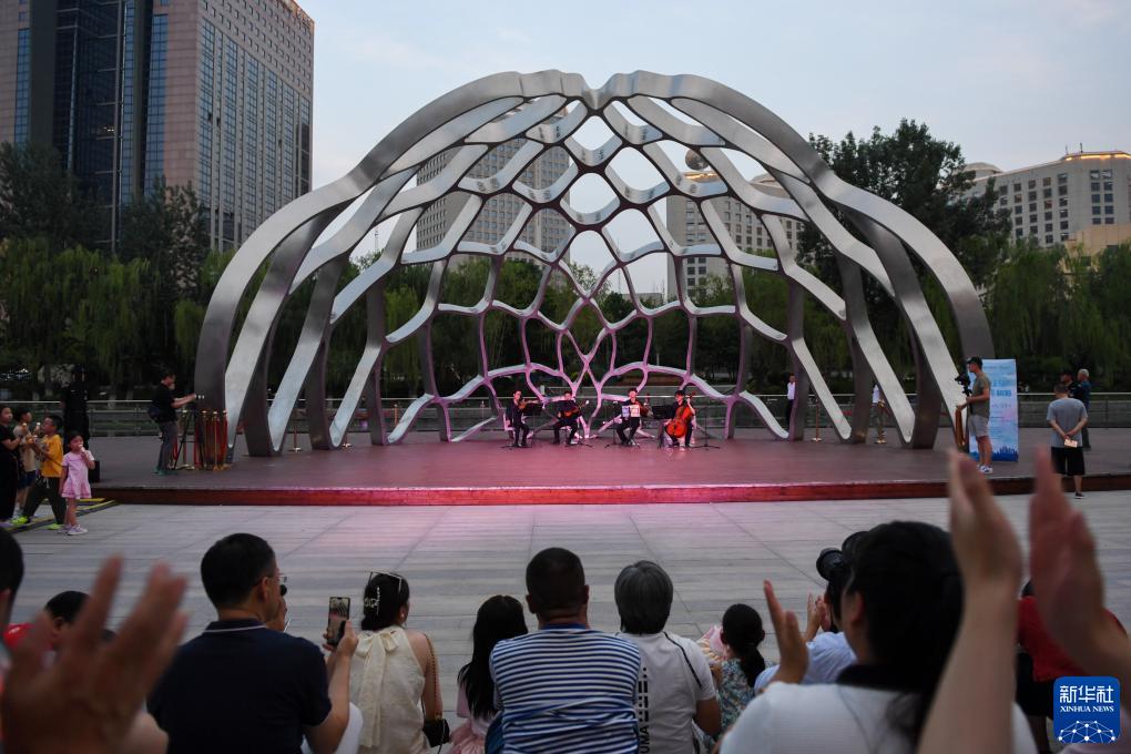 這是人們在北京亮馬河畔觀看“亮馬河藝術之夜”演出(6月23日攝)。