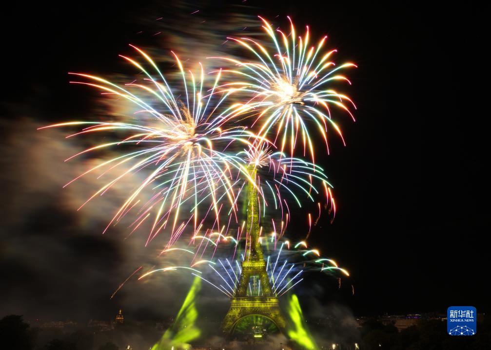 7月14日,焰火在法國巴黎埃菲爾鐵塔周圍綻放。