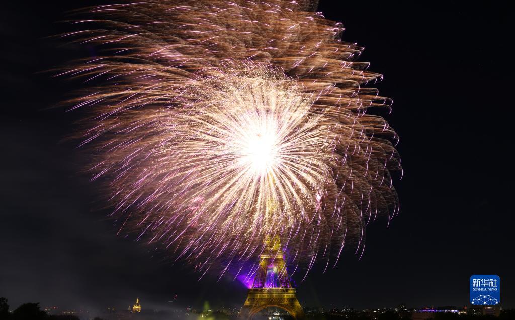 7月14日,焰火在法國巴黎埃菲爾鐵塔周圍綻放。