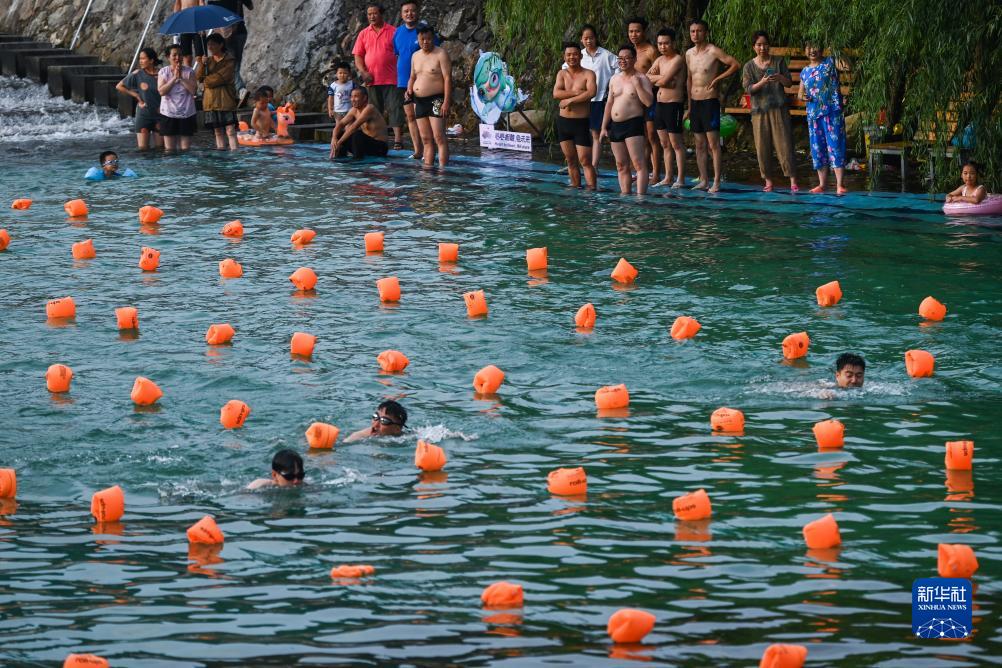 7月14日,村民在乾潭鎮(zhèn)下包村胥溪天然泳場參加趣味比賽。