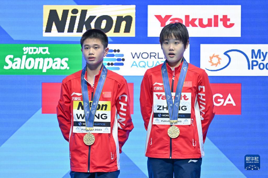 當(dāng)日,在2023年福岡世界游泳錦標(biāo)賽跳水混雙10米臺決賽中,中國組合王飛龍/張家齊以總分339.54分的成績奪得冠軍。