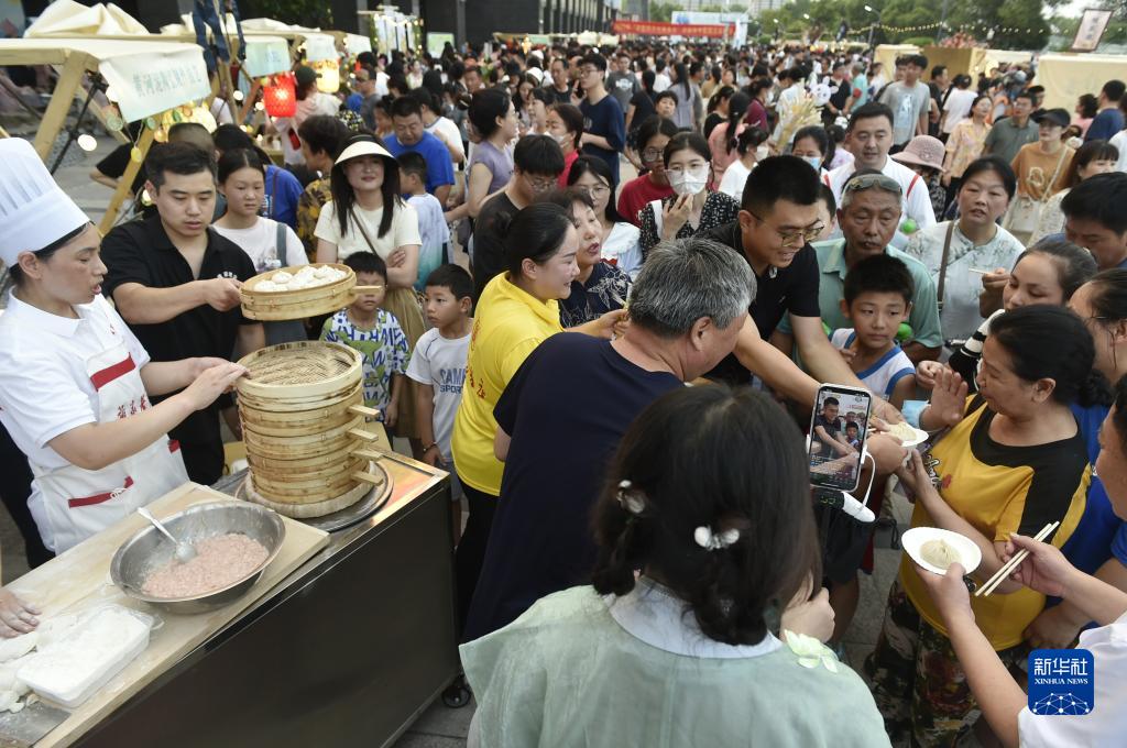 7月14日傍晚,游人在開(kāi)封市開(kāi)元廣場(chǎng)設(shè)立的“非遺市集”現(xiàn)場(chǎng)品嘗開(kāi)封灌湯包。