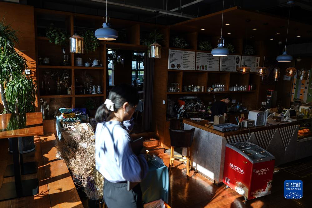 7月14日,隨著一名工作人員走進咖啡館,園區室內燈光根據動態智能調節亮度。