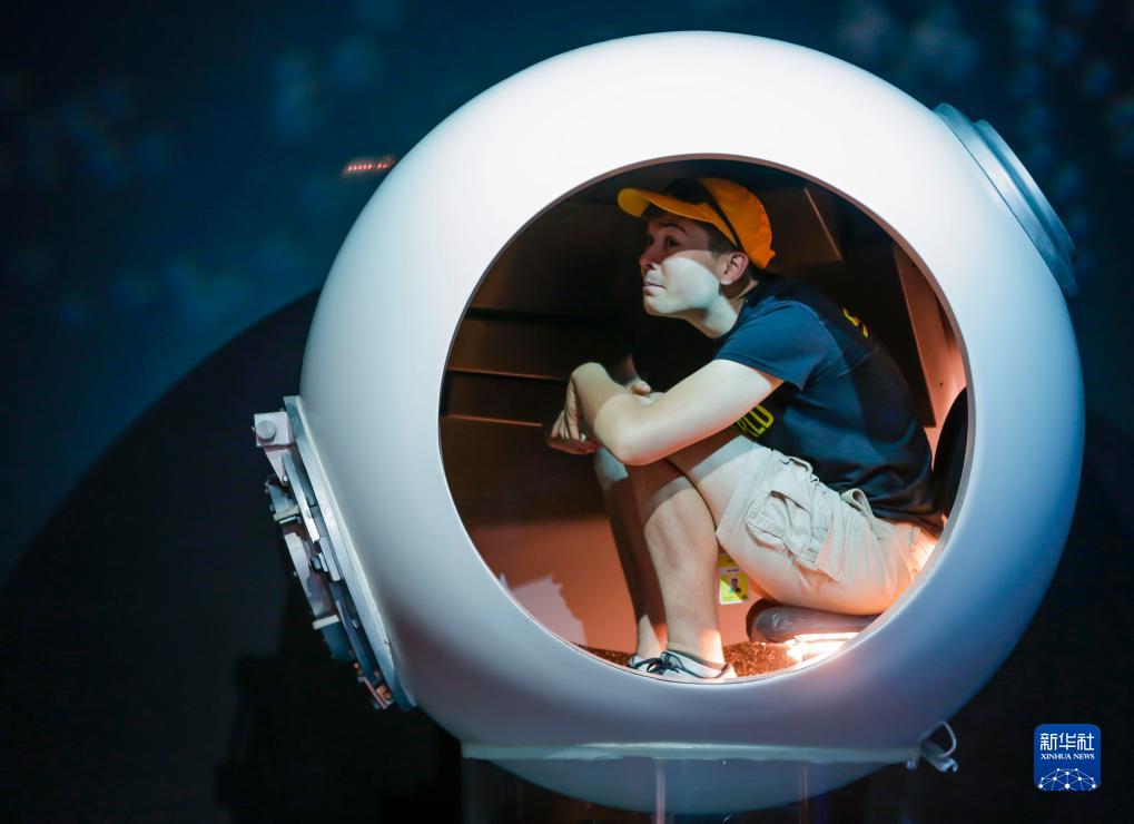 7月10日,在加拿大溫哥華舉辦的“挑戰深海”專題展上,參觀者體驗“深海挑戰者”號載人潛水器的圓形駕駛室。