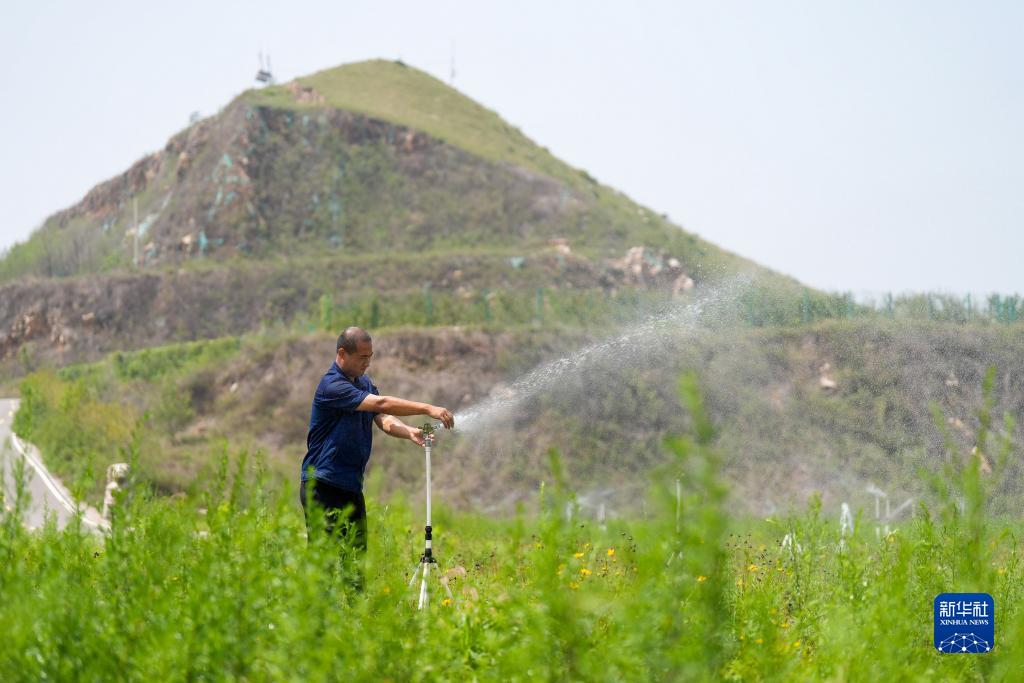 7月14日,工人在河北省唐山市古冶區(qū)一處礦山修復(fù)區(qū)內(nèi)檢修噴灌設(shè)施。