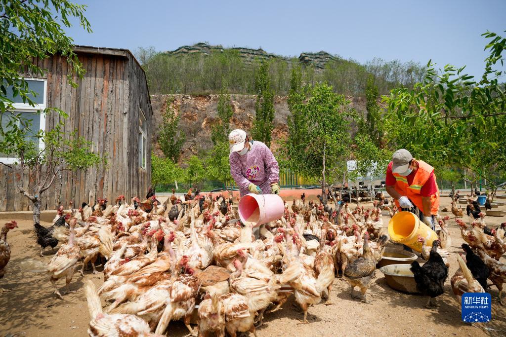7月14日,工人在河北省唐山市古冶區(qū)一處修復(fù)礦山后建成的養(yǎng)殖場內(nèi)工作。