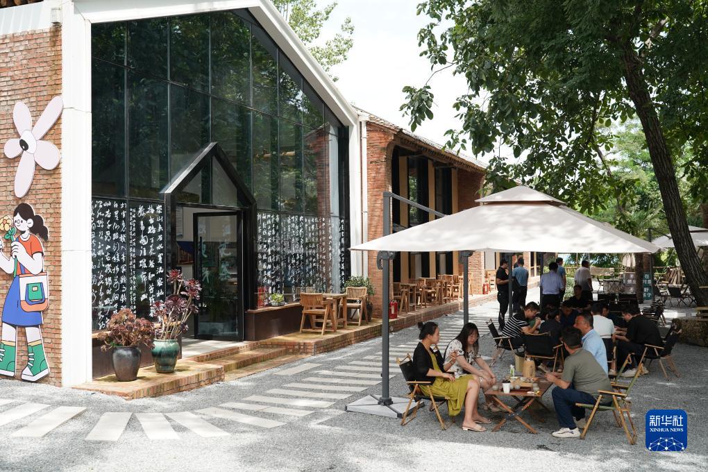 7月14日,游人在周至縣駱峪鎮紅旗村的鄉村會客廳內休閑。