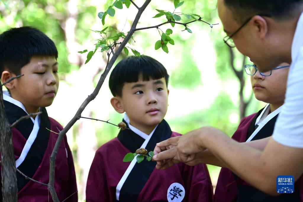 7月15日,參加中醫(yī)藥文化主題夏令營(yíng)的小學(xué)生在野外了解中藥蟬蛻。
