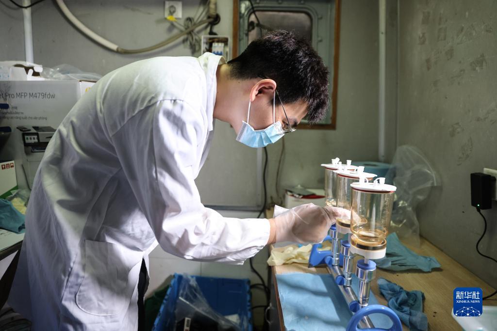 6月30日,第六次南海深潛及遠海鯨類科考航次的科研人員在進行水樣過濾。