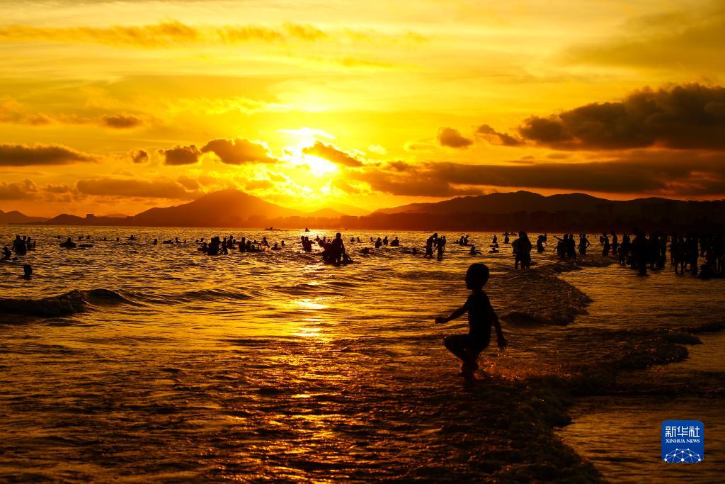 7月11日,家長(zhǎng)帶著孩子在海南省三亞市三亞灣戲水消暑。