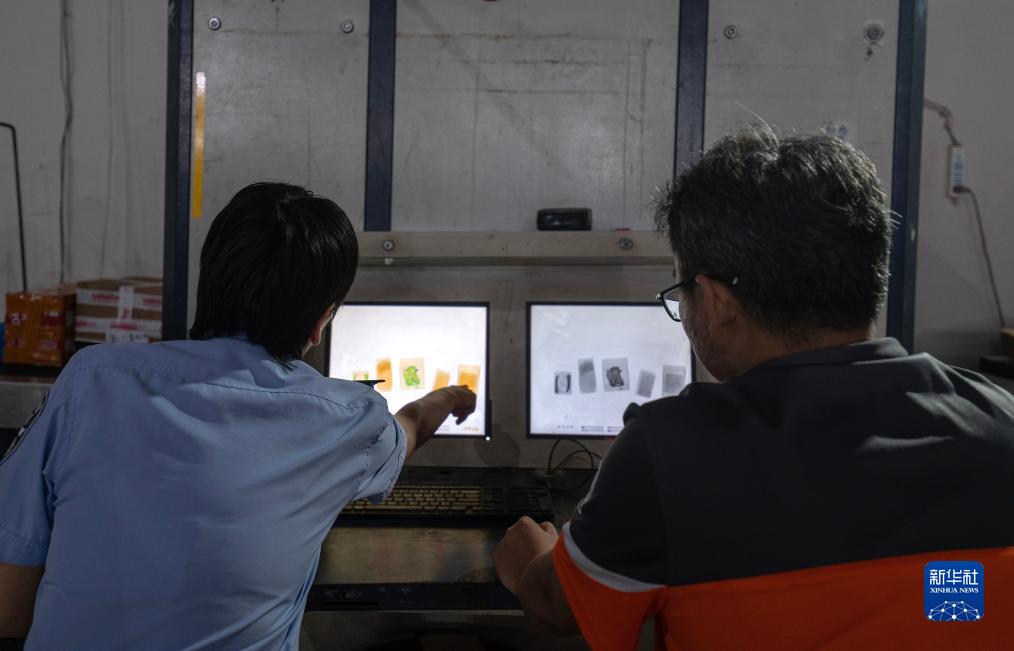 7月12日,尹銘燕(左)在芒市一處物流點對快遞包裹進行查緝。