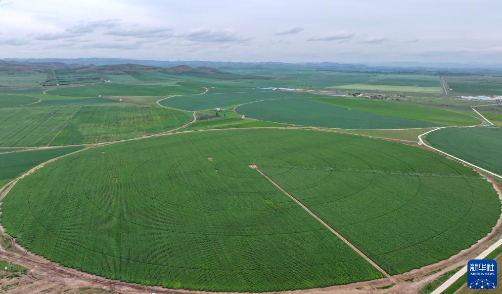 7月15日在張家口市塞北管理區拍攝的裝有指針式噴灌設備的農田(無人機照片)。