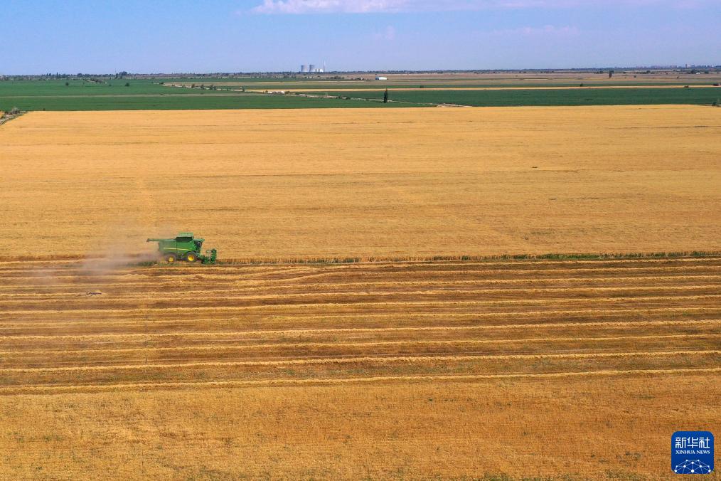 農機手駕駛聯合收割機在新疆呼圖壁縣二十里店鎮寧州戶村收割小麥(7月15日攝,無人機照片)。