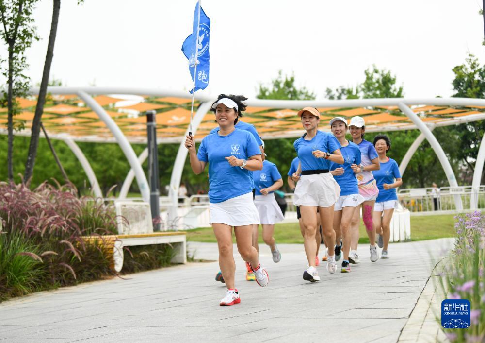 在成都市龍泉驛區東安湖體育公園,杜以萍(前)帶領跑團成員跑步(7月12日攝)。