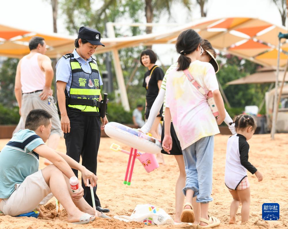 在成都市龍泉驛區(qū)東安湖體育公園銀沙灘,杜以萍(左二)提醒帶著孩子游玩的家長注意安全(7月12日攝)。