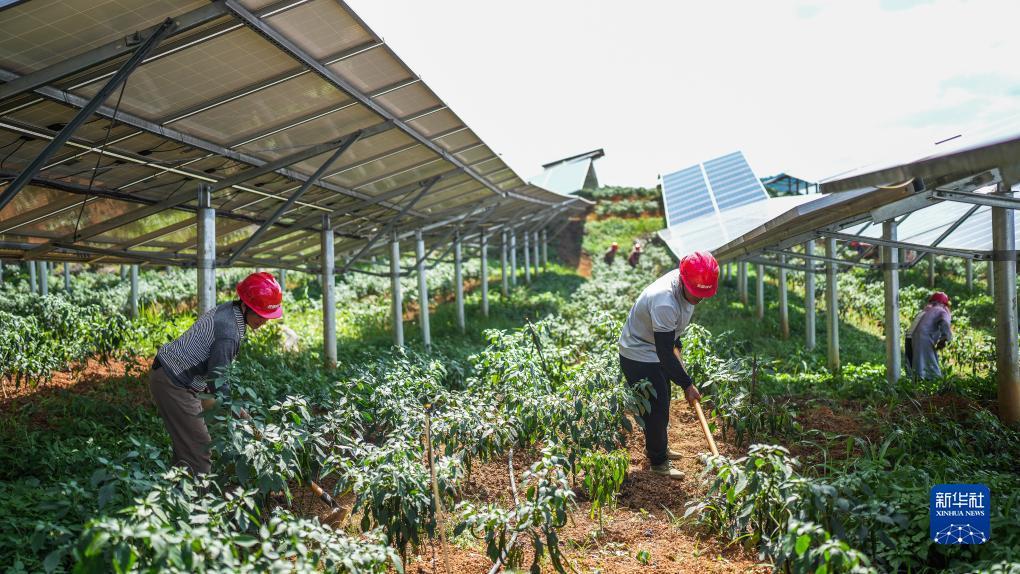 村民在貴州金元木科農業光伏電站光伏板下的土地種植辣椒(7月5日攝)。