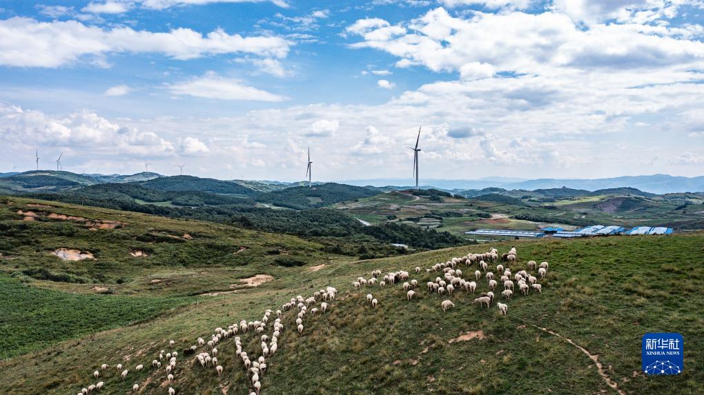 威寧彝族回族苗族自治縣雪山鎮村民養的羊群在風力發電設備下的草場吃草(7月13日攝,無人機照片)。