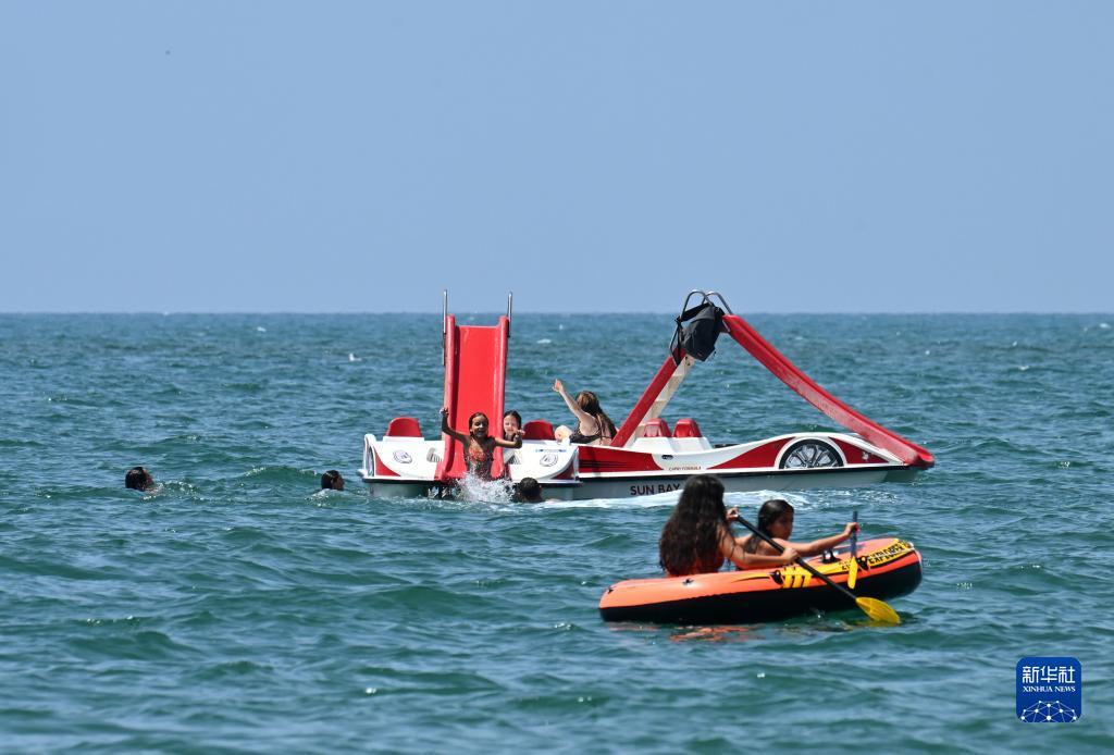 7月16日,在意大利拉迪斯波利,人們在海中嬉戲。