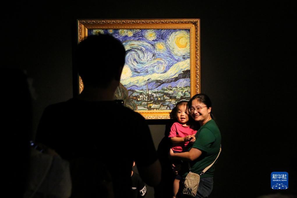 7月16日晚,參觀者在“梵高再現”光影展上拍照留念。