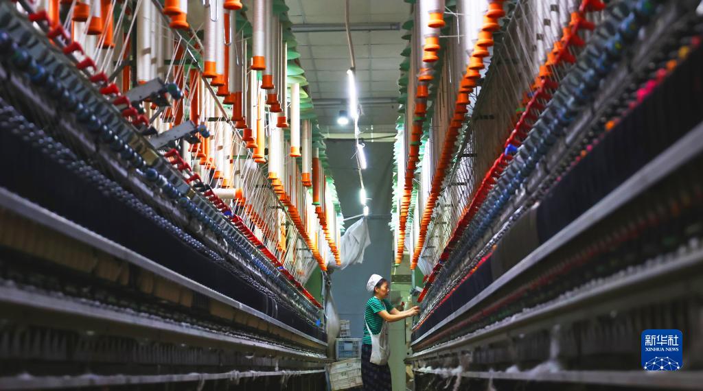 7月17日,在江蘇省連云港市海州區(qū)一家紡織企業(yè),工人在生產(chǎn)線上忙碌。