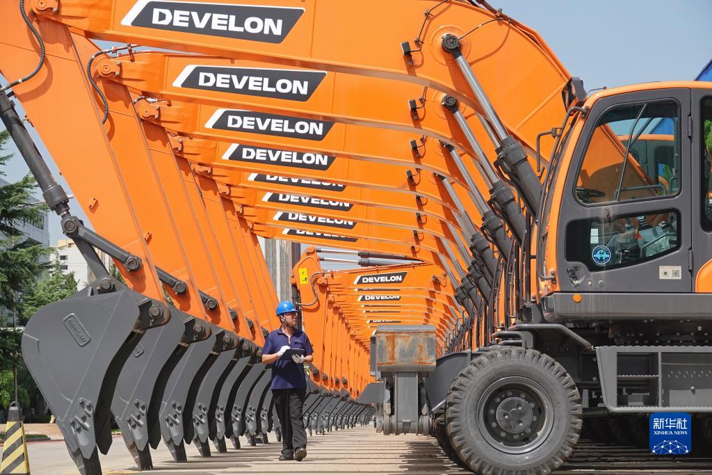 7月17日,在位于山東煙臺的一家工程機械公司,工作人員在檢查出廠的挖掘機。