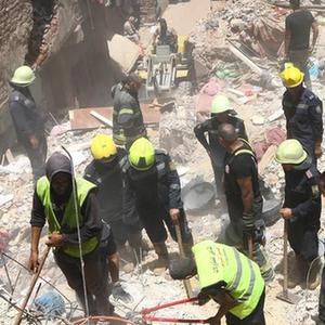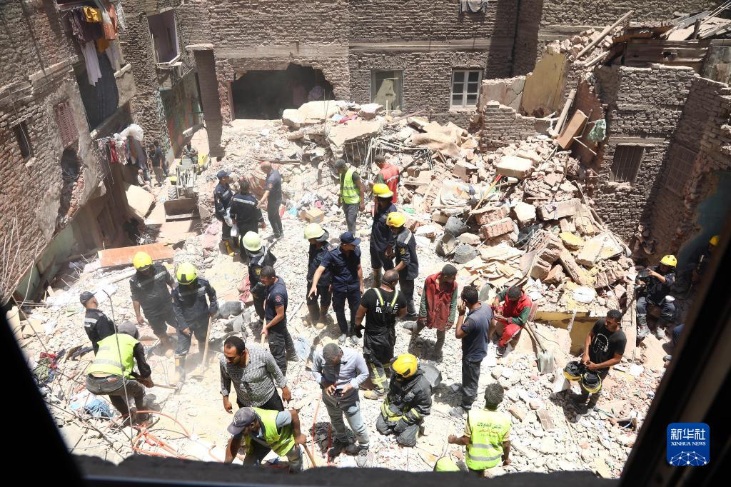 7月17日,救援人員在埃及首都開羅的居民樓坍塌現場工作。